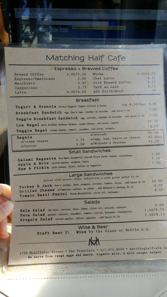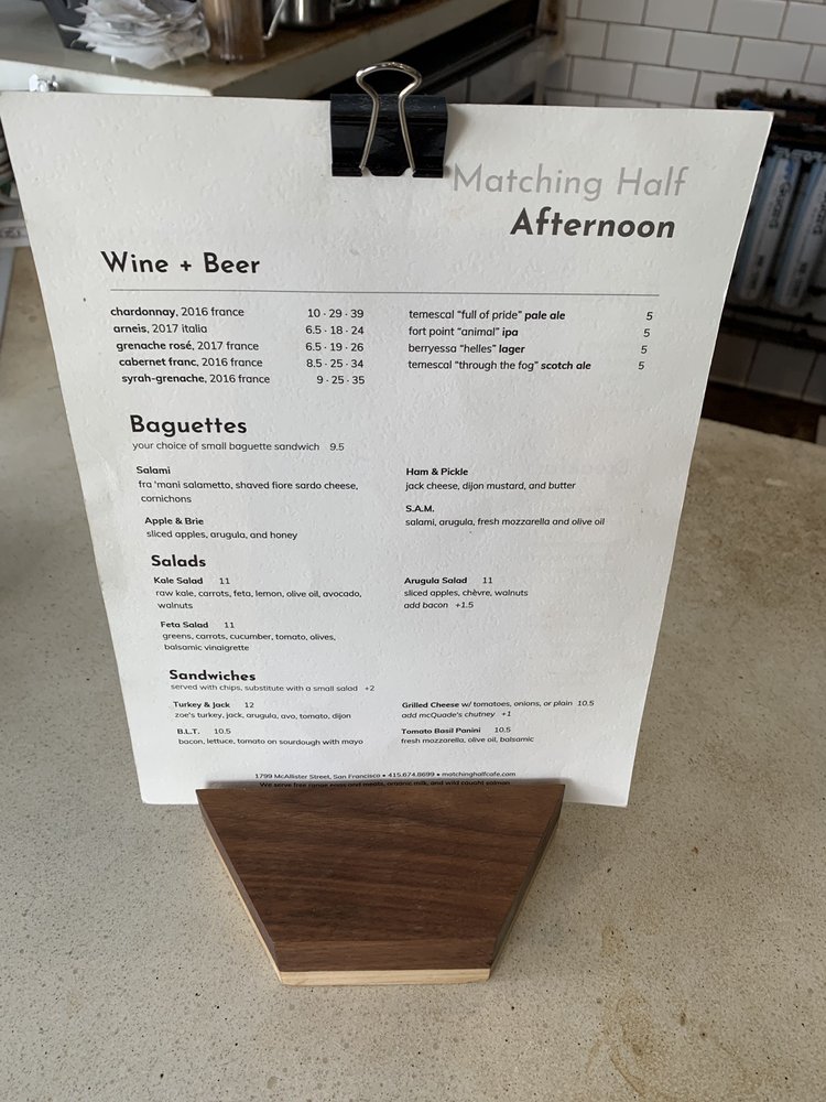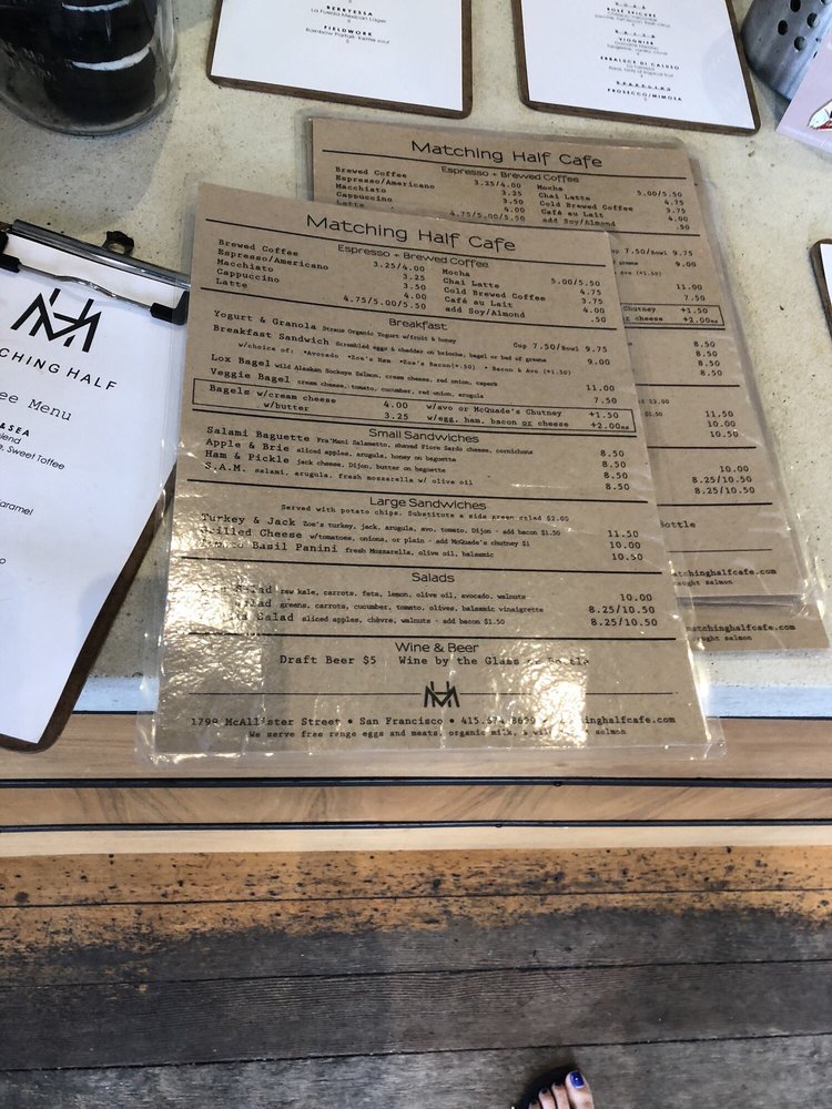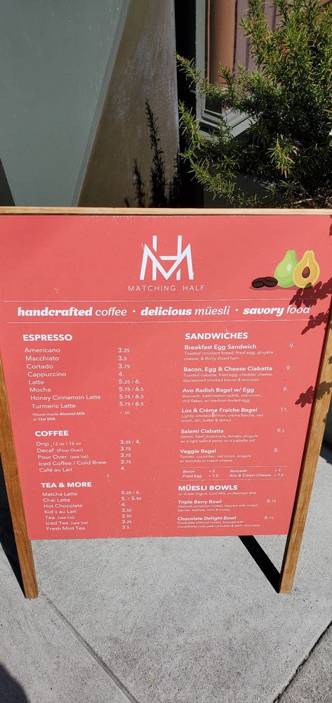 Matching Half Cafe, located in San Francisco, offers a diverse menu of coffee & tea, breakfast & brunch, and sandwiches. With a range of utilities such as takeout, delivery, outdoor seating, and free Wi-Fi, this cafe caters to a variety of preferences. Customers rave about the delightful food and excellent service, praising the hot and fast sandwiches and heavenly coffee. Standout dishes include the Avo Radish Bagel w/Egg, Bacon, Egg & Cheese Ciabatta, and Turmeric Latte. The cafe's charming interior, gender-neutral restrooms, and welcoming baristas create a cozy ambiance for guests. Whether you're looking for a relaxing spot to work or a delicious meal, Matching Half Cafe impresses with its quality offerings and friendly atmosphere.